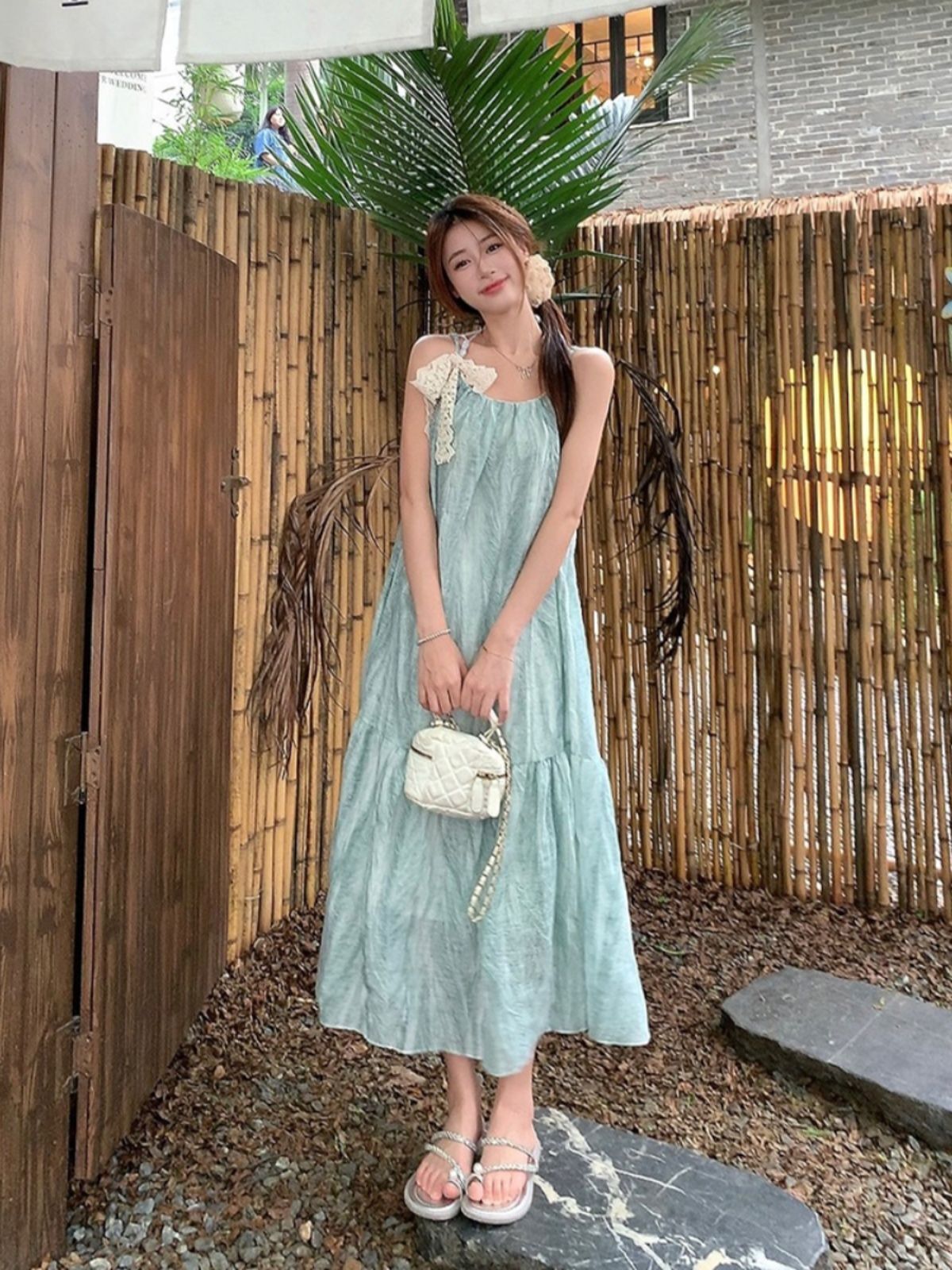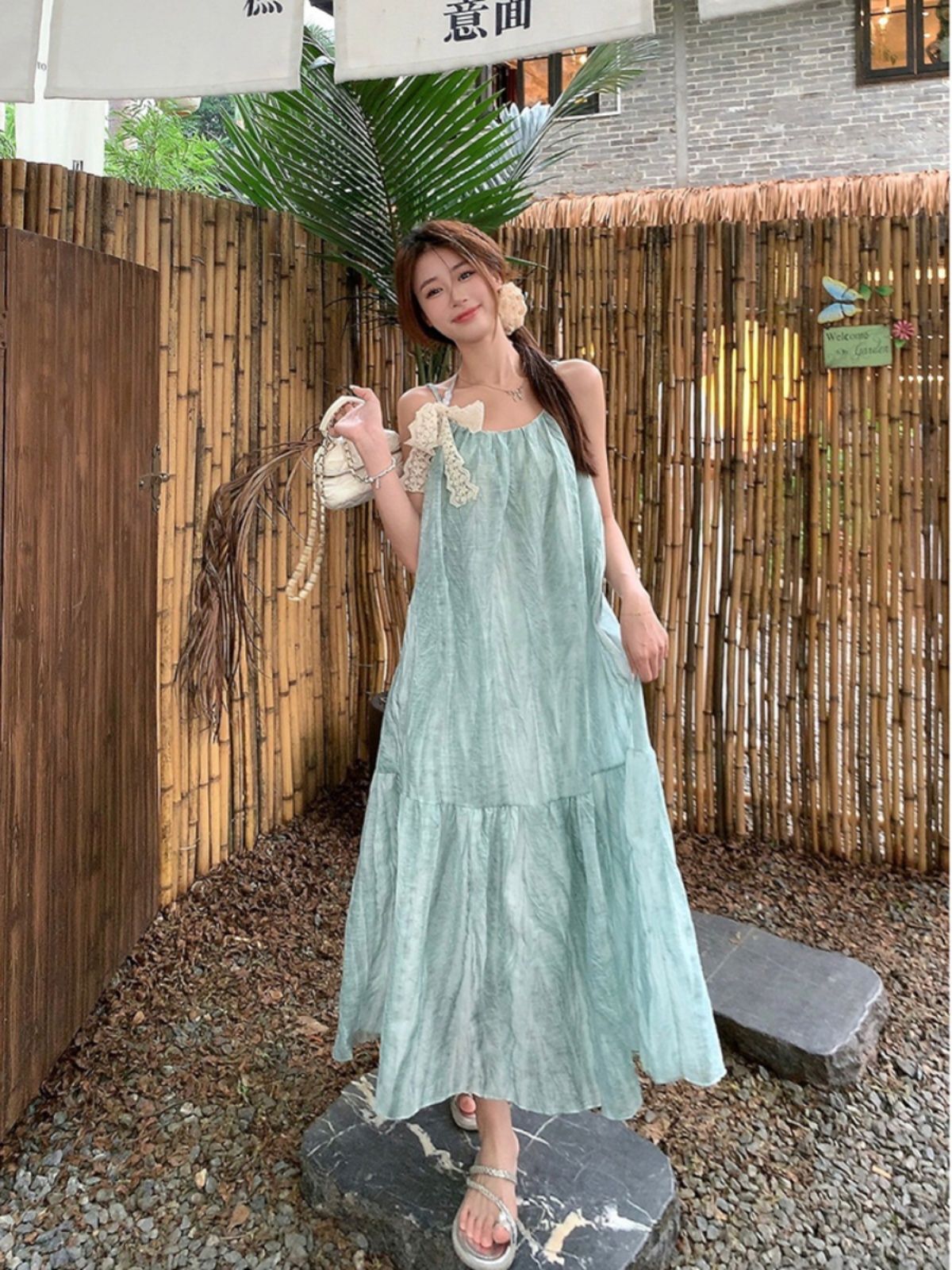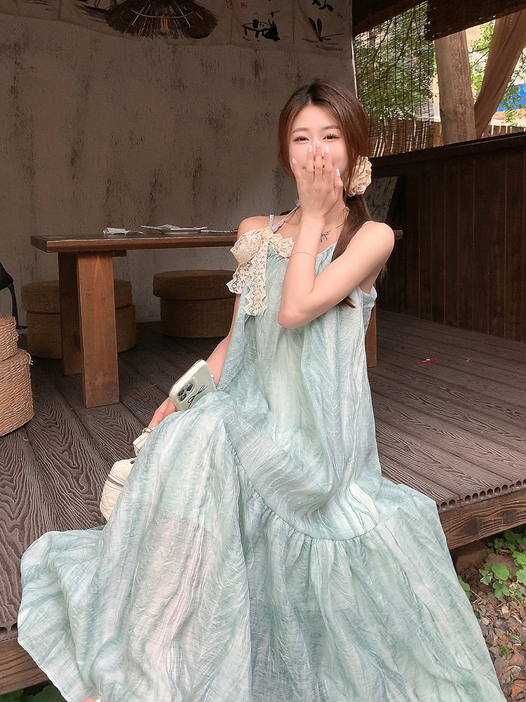 Mint green tie-dye sundress for women, a fresh and loose-fitting summer vacation dress
