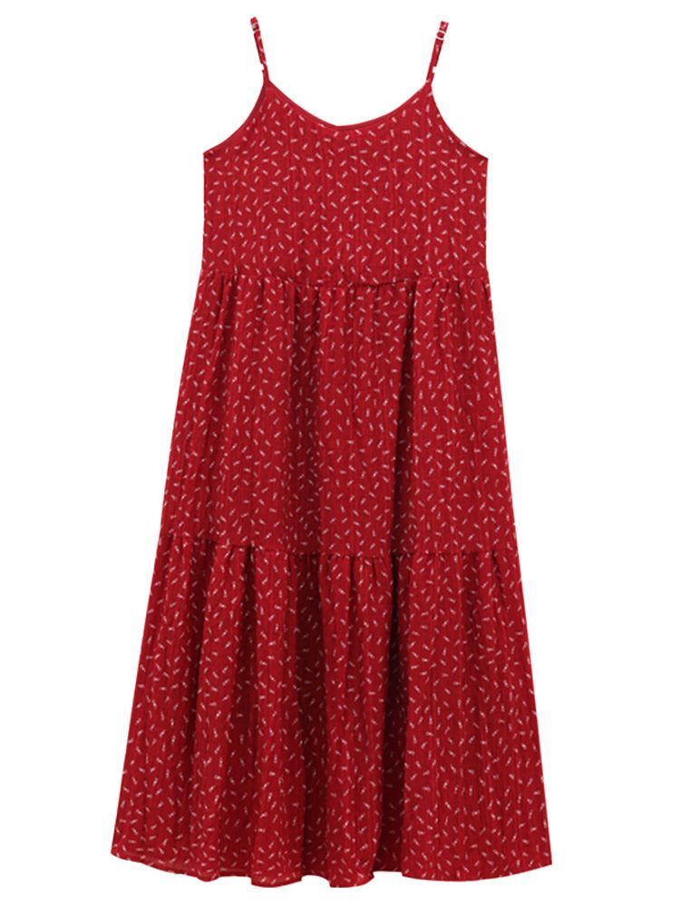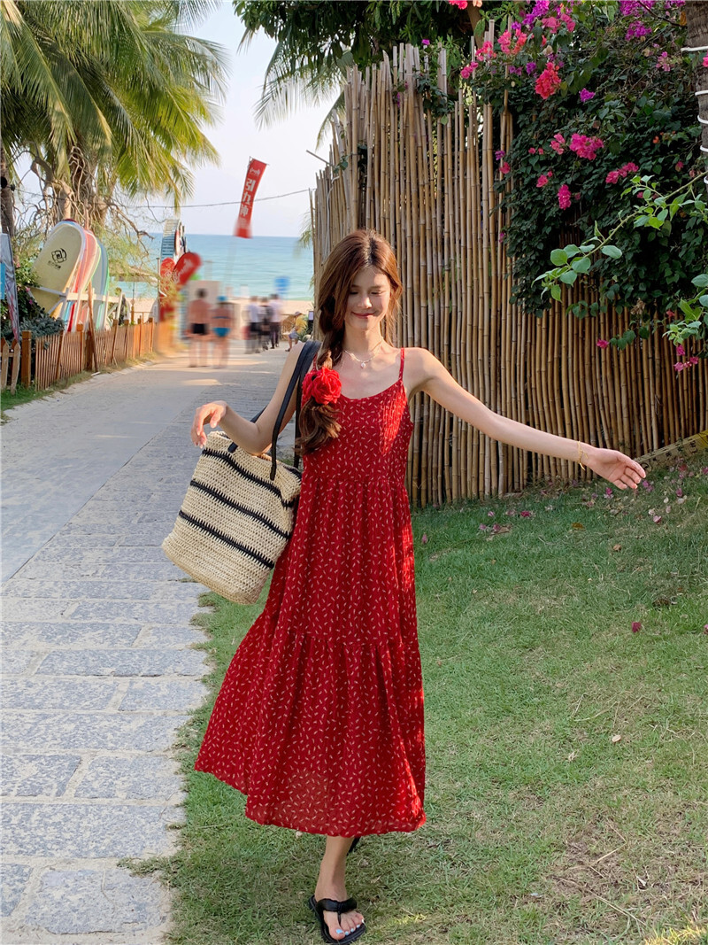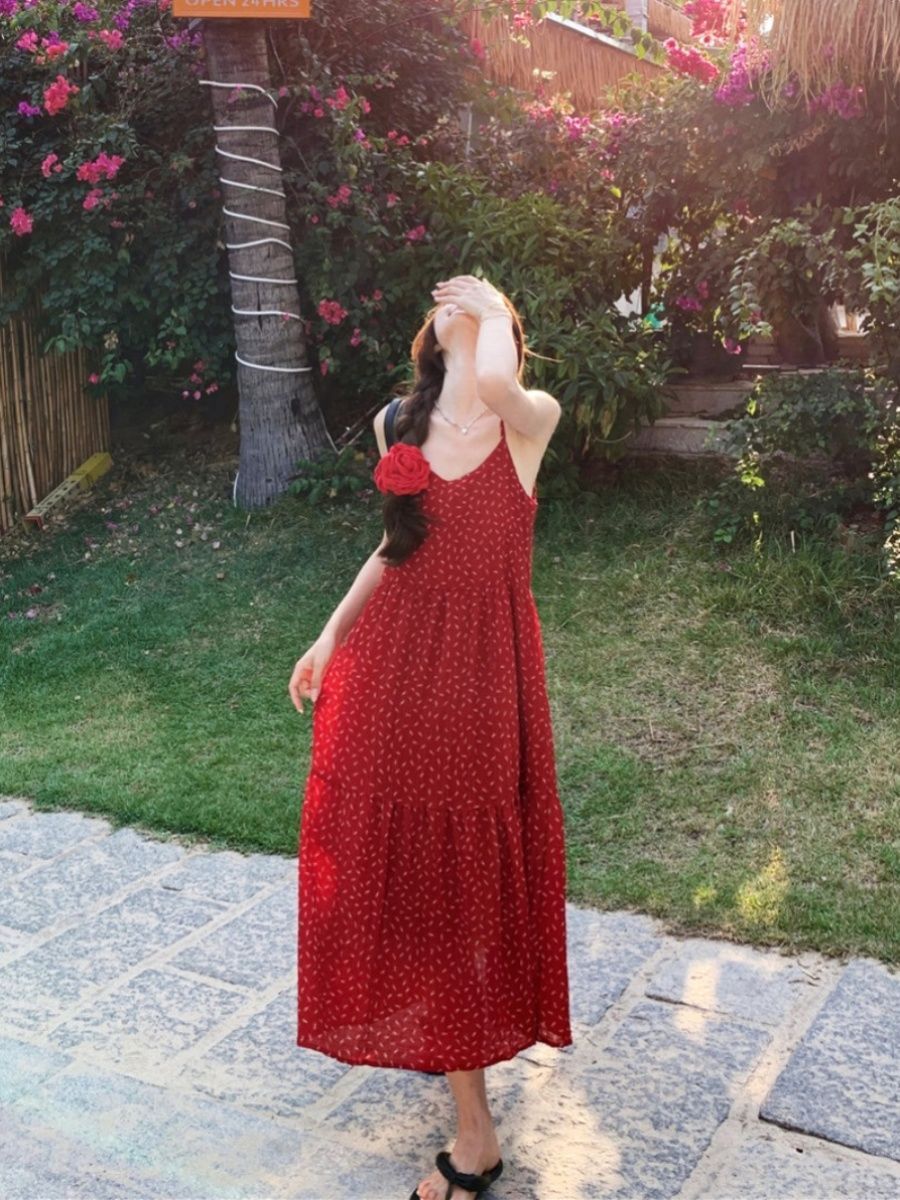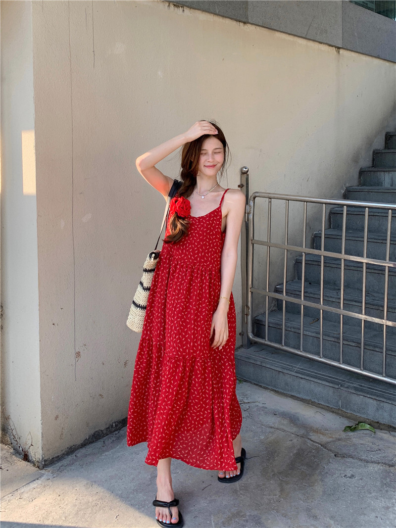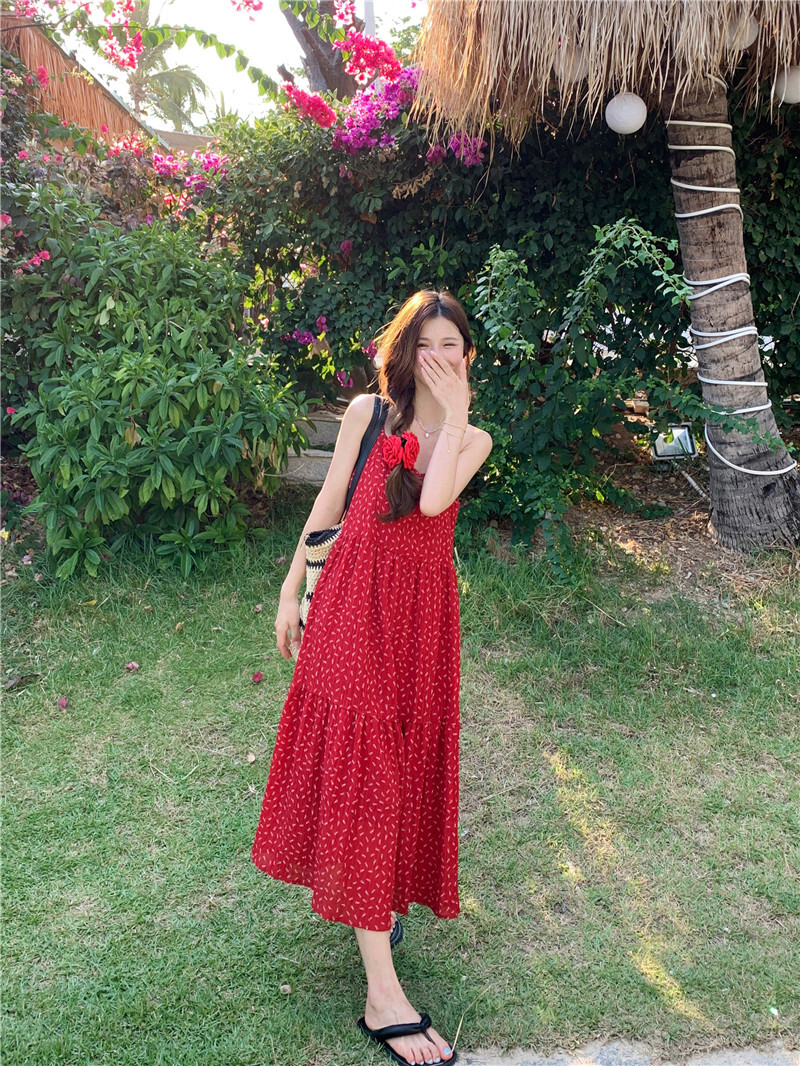 • A sexy red floral print sundress with a loose, slimming design.