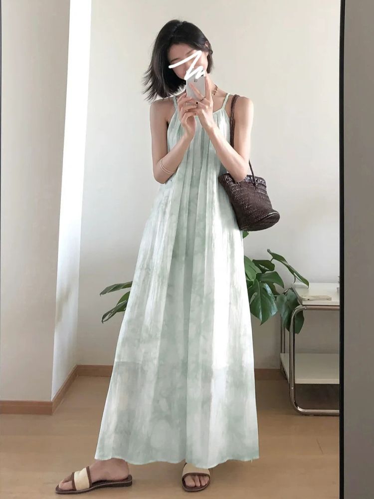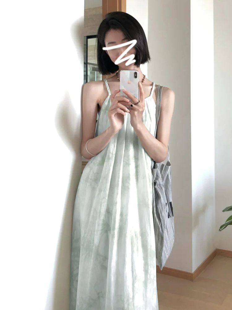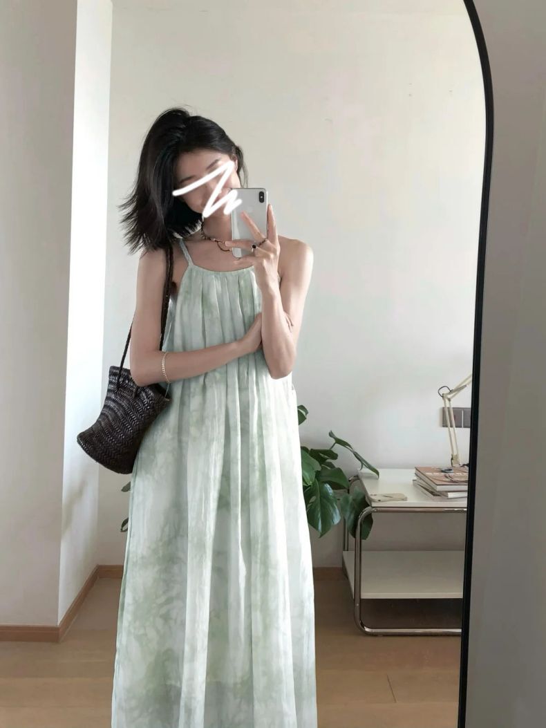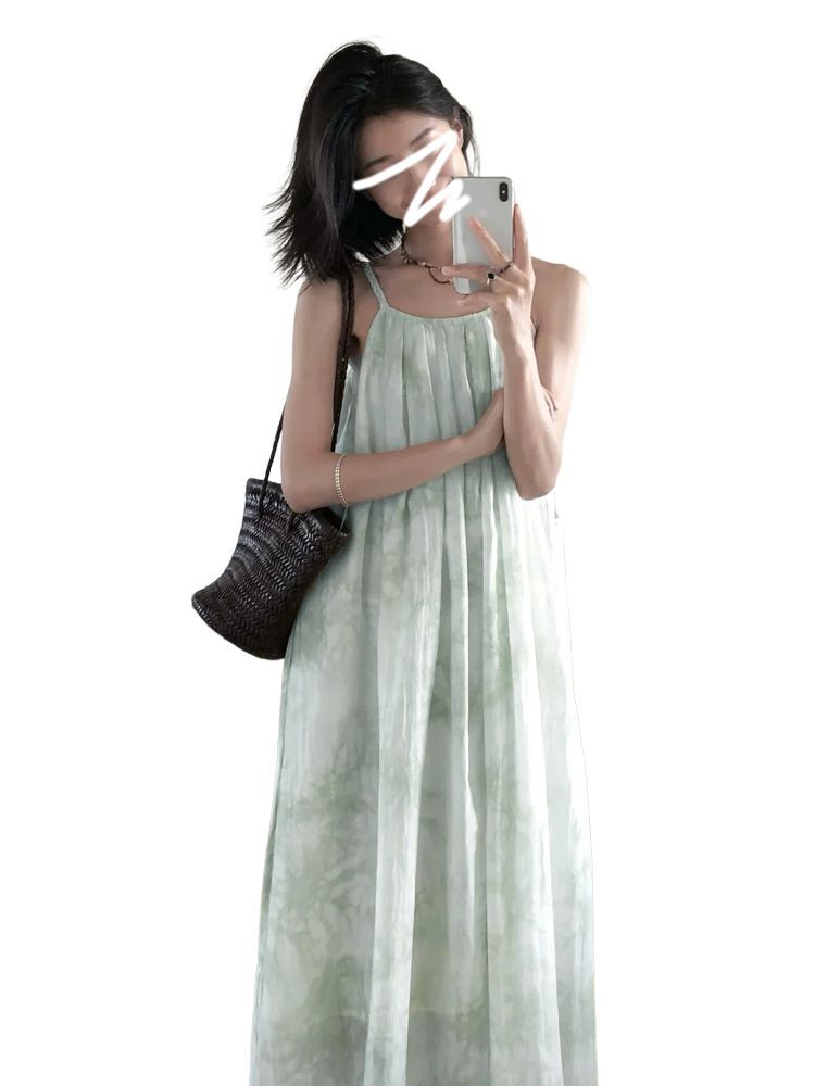 • Green spaghetti strap dress for women, new summer 2025 style, French niche design, elegant and slimming for petite figures.