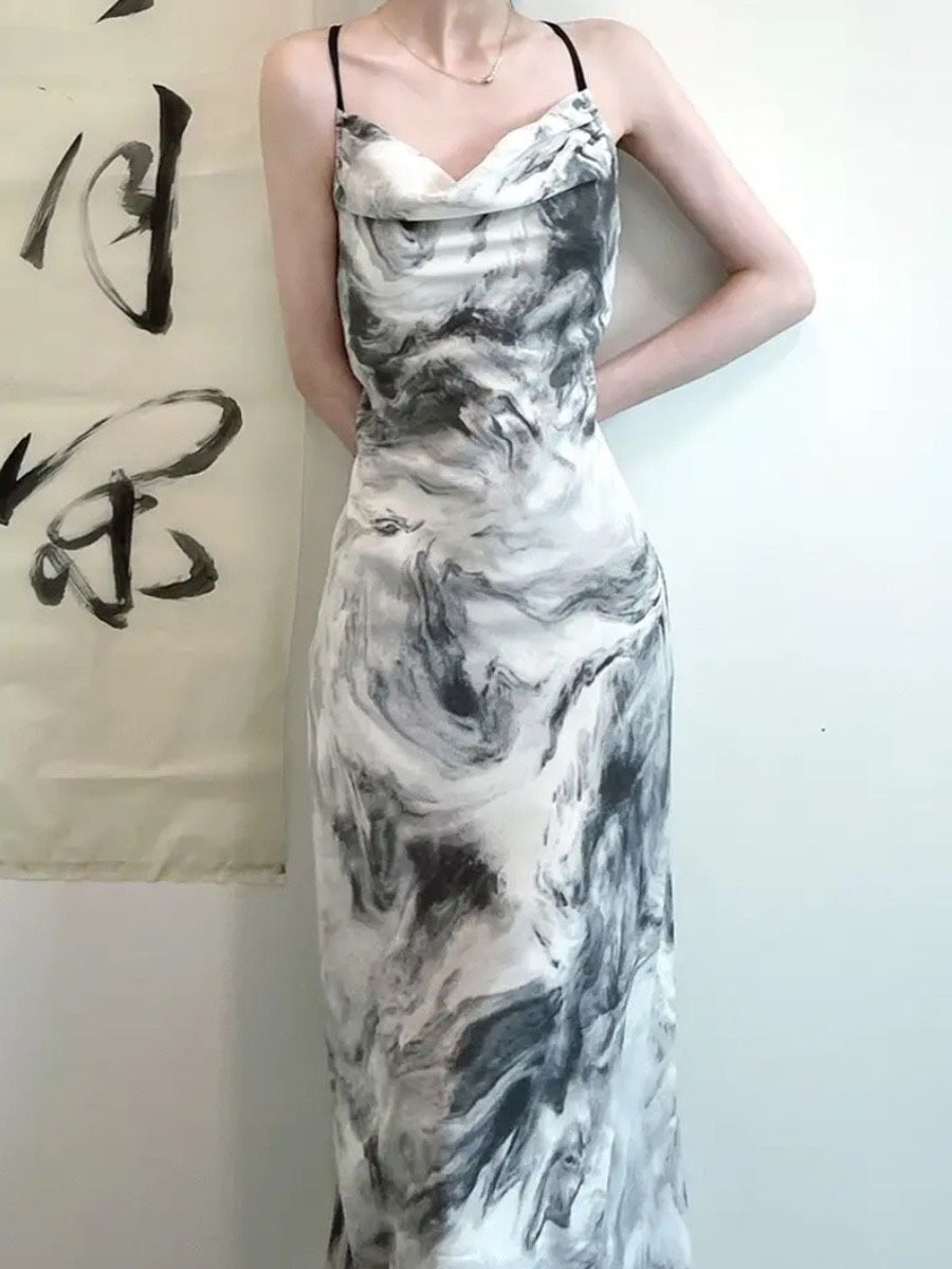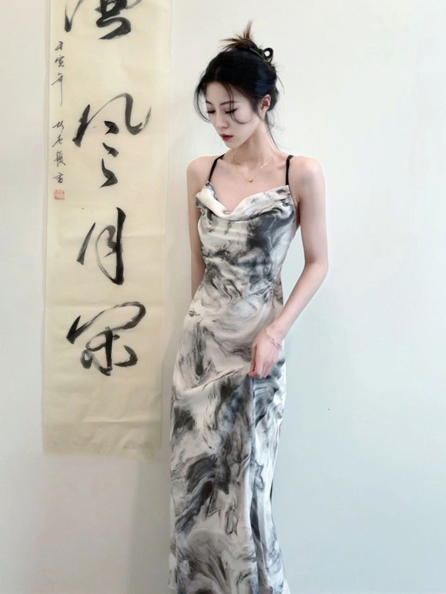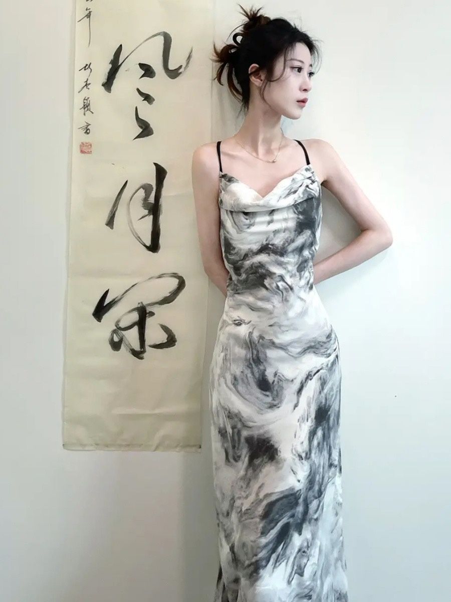 • Plus-size ink painting style halter dress for women, summer 2024 new style, new Chinese style open back design for chubby girls.