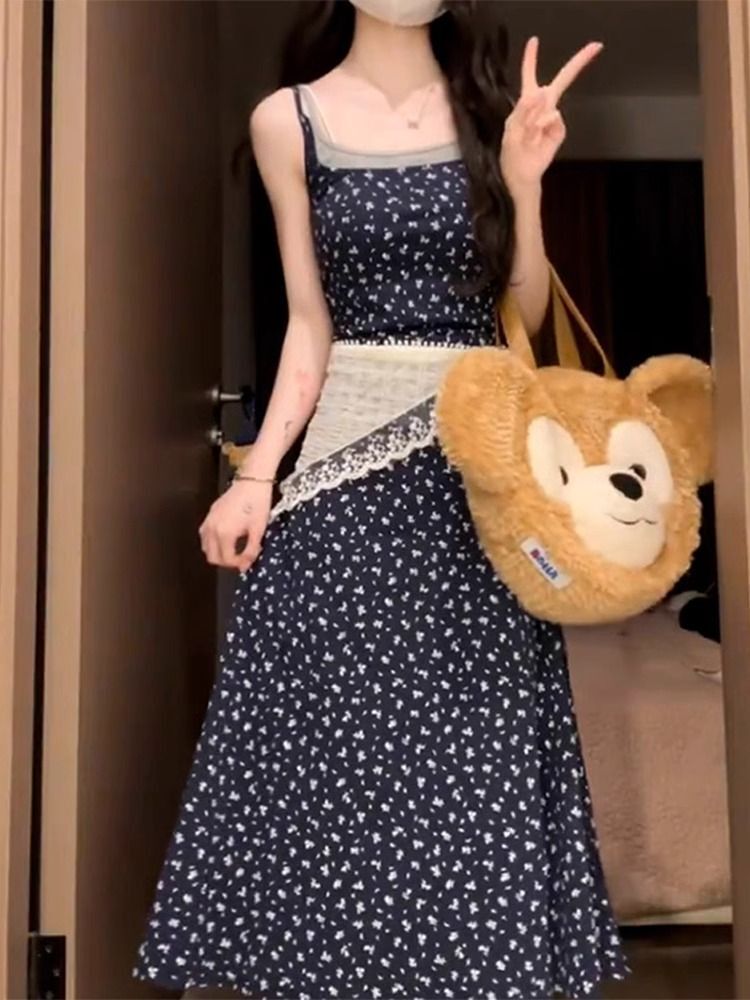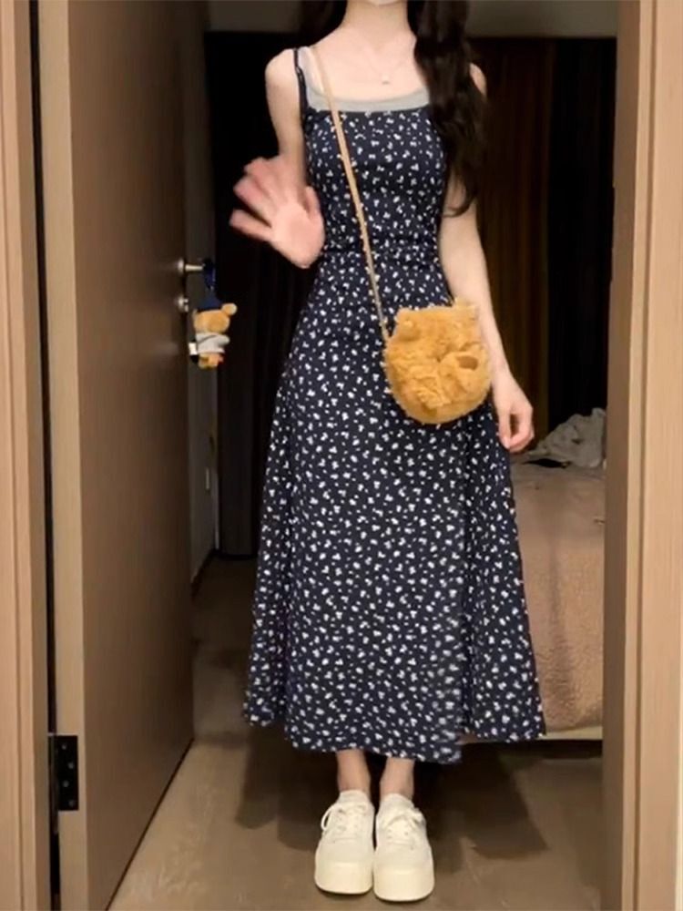 Korean style two-piece floral print slip dress, slim fit, waist-cinching, and flowy.