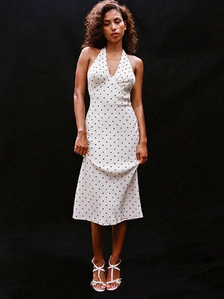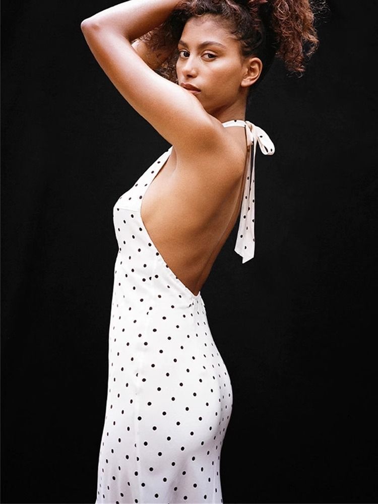 ***Same style white polka dot V-neck halter dress for women, summer French sexy backless elegant midi dress