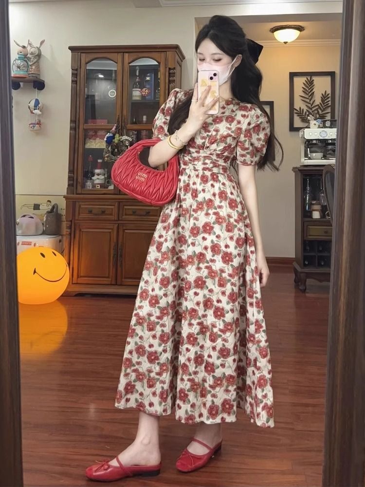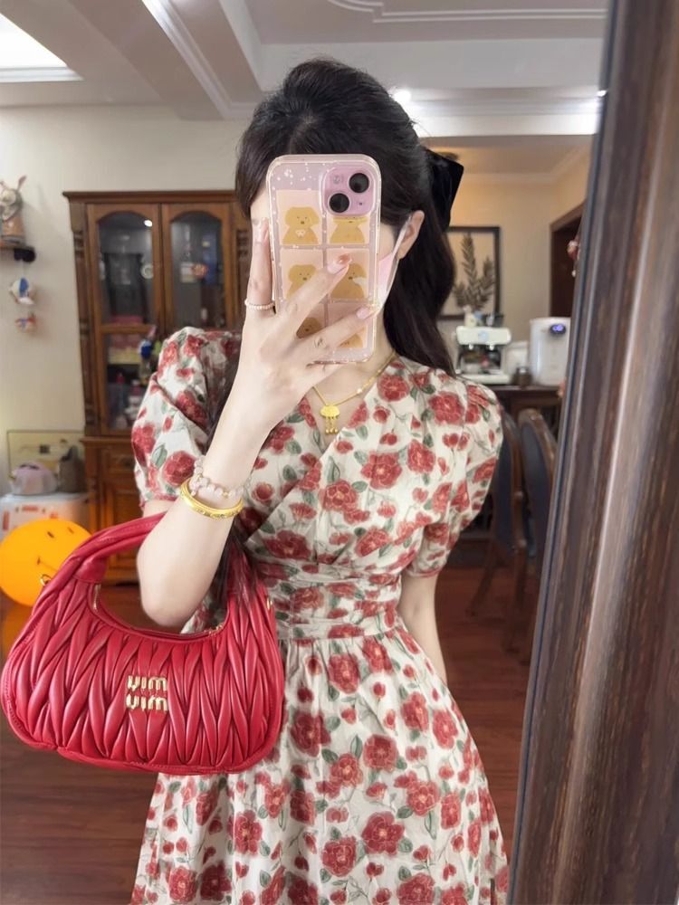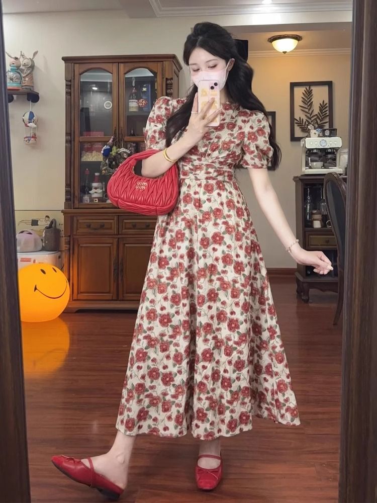 • 2025 New French Style Red Floral Dress for Women - Summer Elegance, Sophisticated, Perfect for Beach Vacations, and Light Luxury