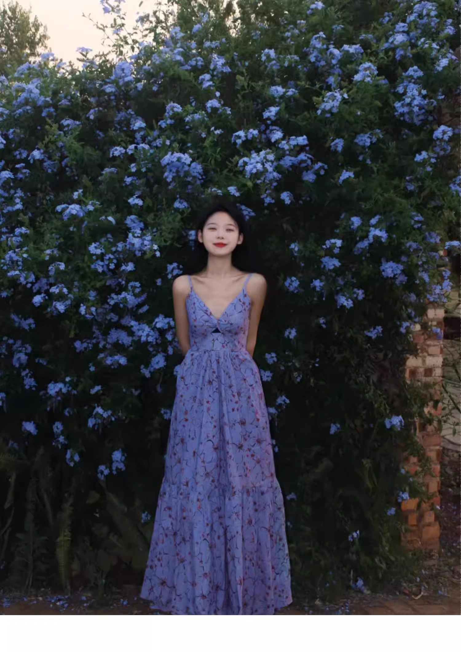 • Plus Size French Style Blue Floral Print Sundress for Women, Summer Elegant V-Neck Backless Vacation Beach Dress