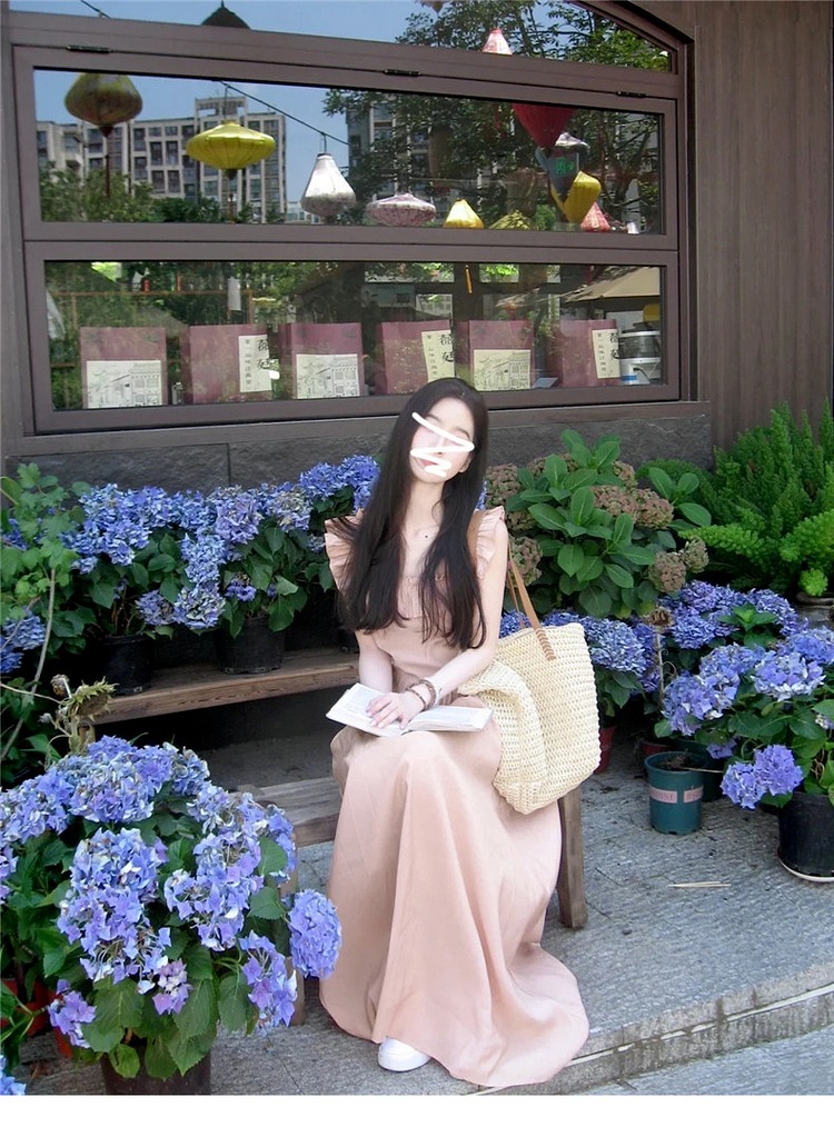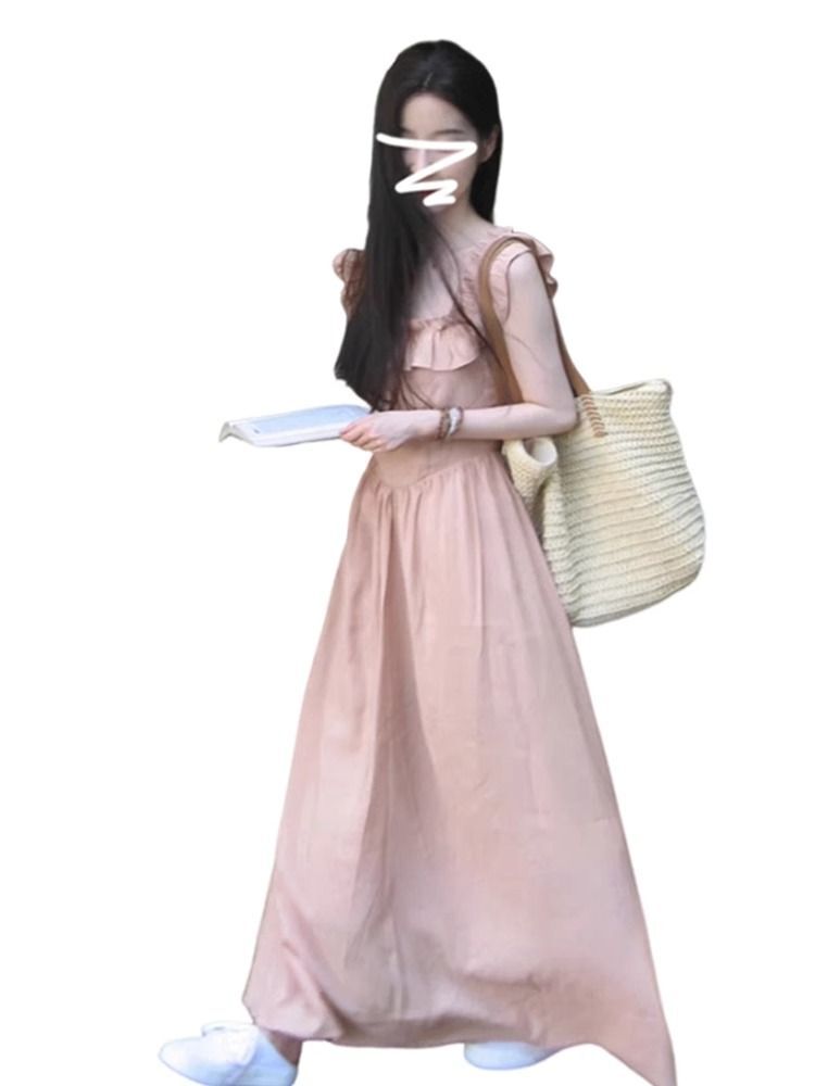 • Sweet pink flutter sleeve dress for women, new summer 2025 style, square neck, fitted waist, gentle French fairy look.
