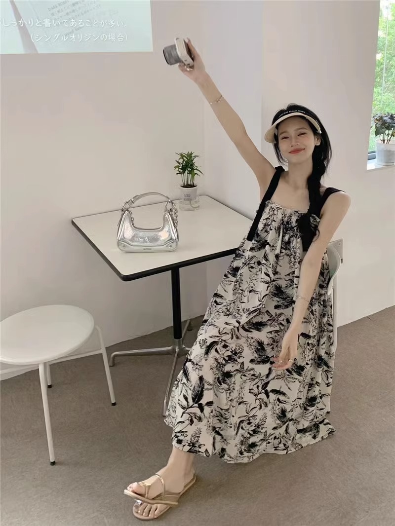 Floral print sundress for beach vacation, long style, petite, 2024 summer, Korean style, casual, loose fit, slimming, strapless.