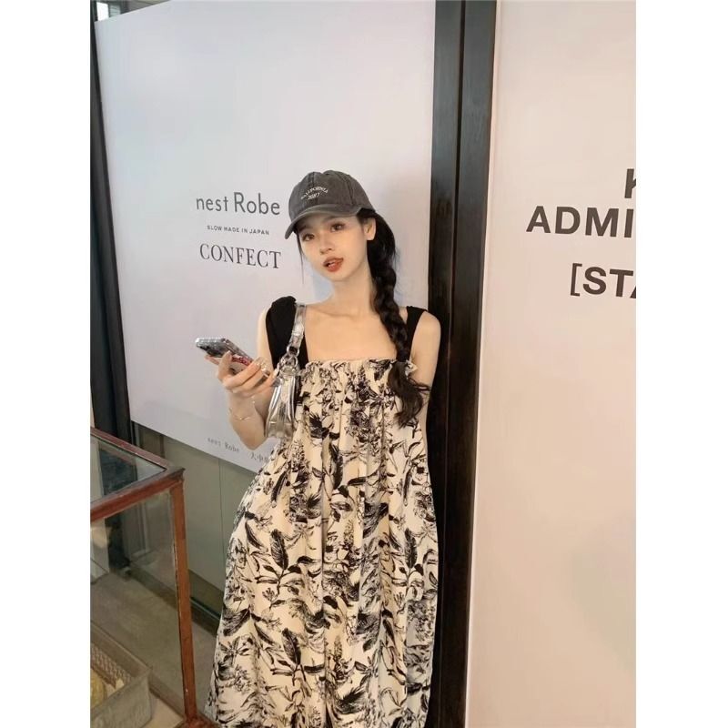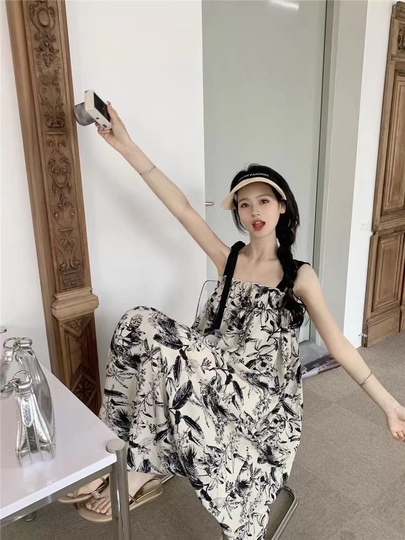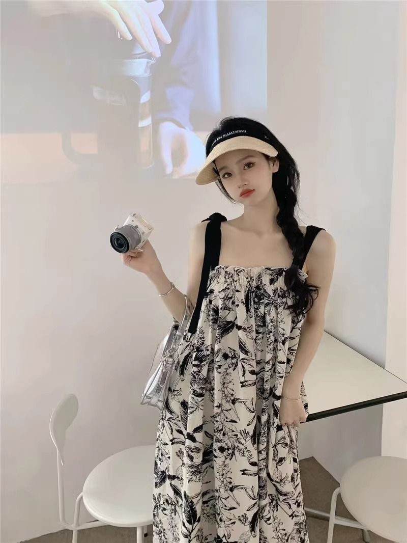 • Floral print sundress for beach vacation, long style, petite, 2024 summer, Korean style, casual, loose fit, slimming, strapless.