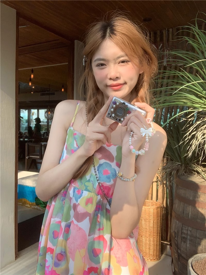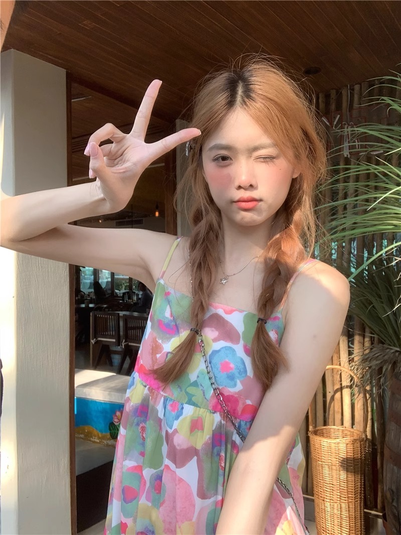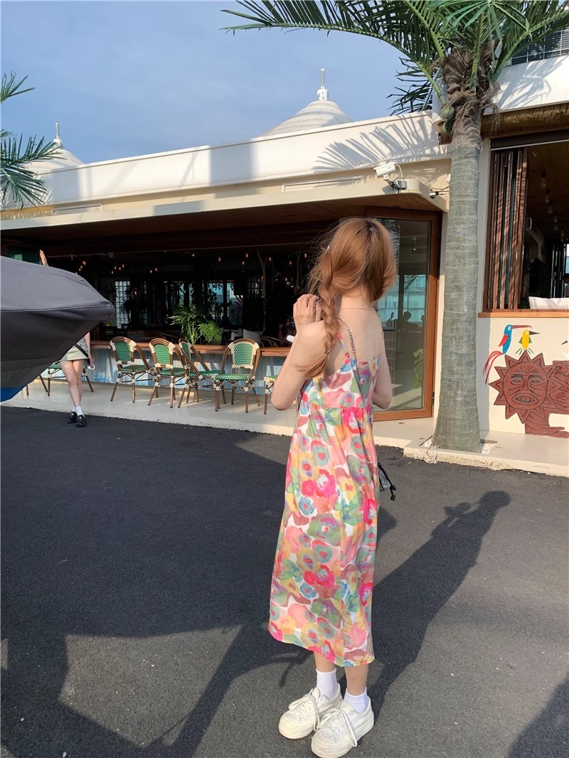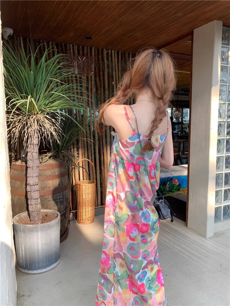 Retro oil painting floral print sundress for women, summer French style, loose fit, slimming, beach vacation vibe, sleeveless long dress