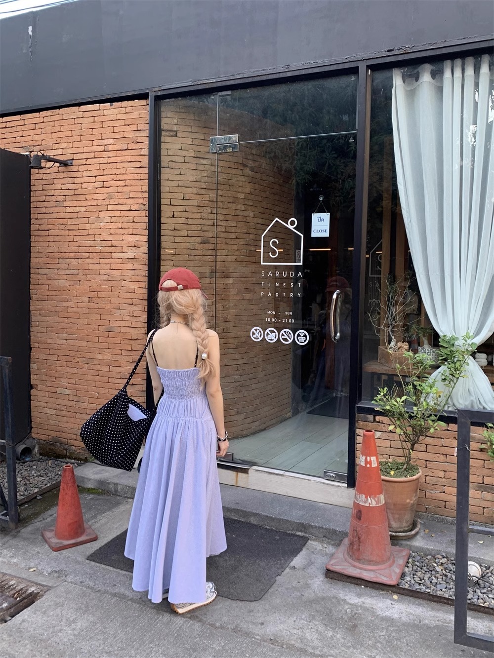 • Blue spaghetti strap dress for women, summer 2025 new style, French beach resort look, fitted waist, long.