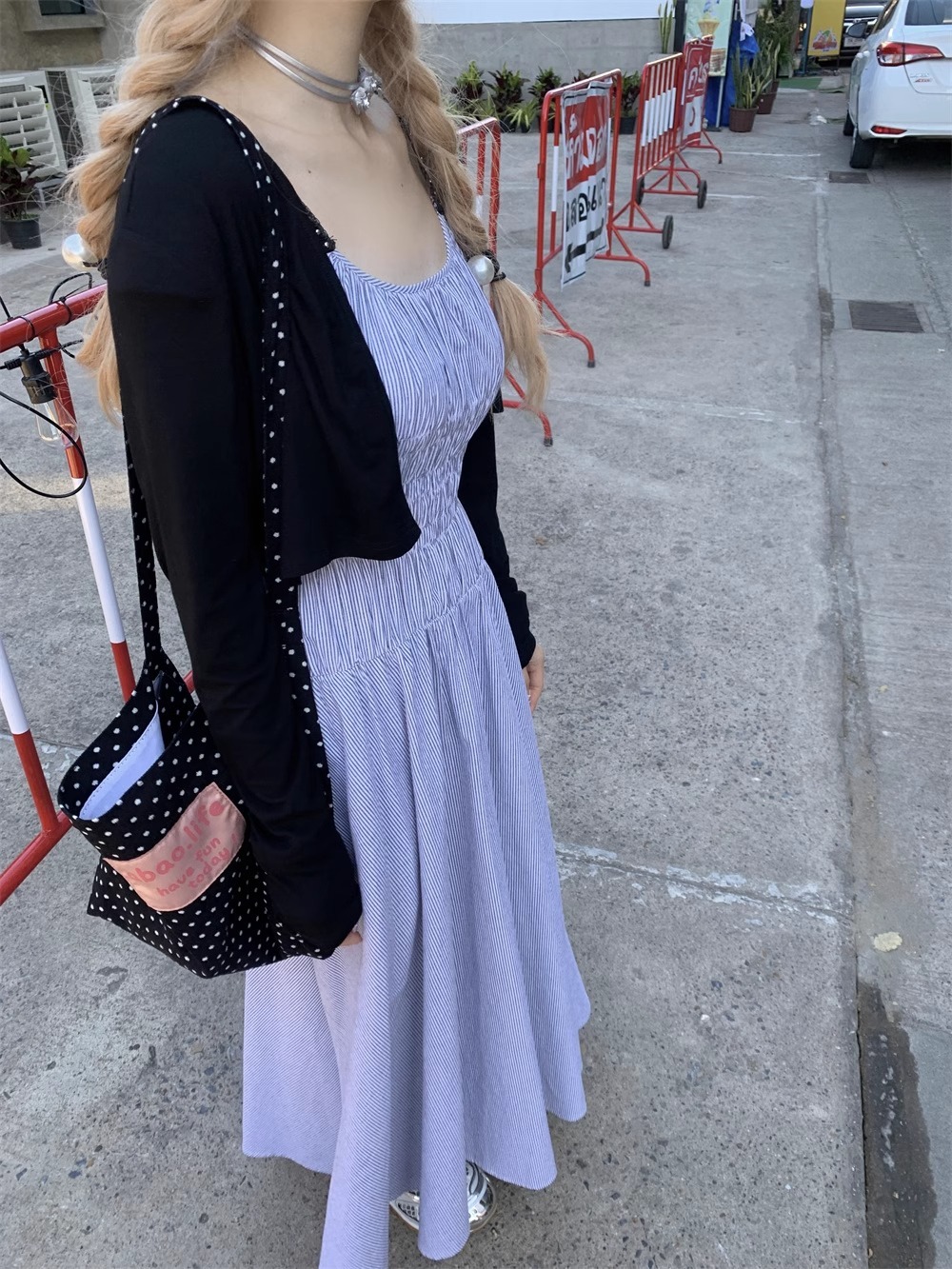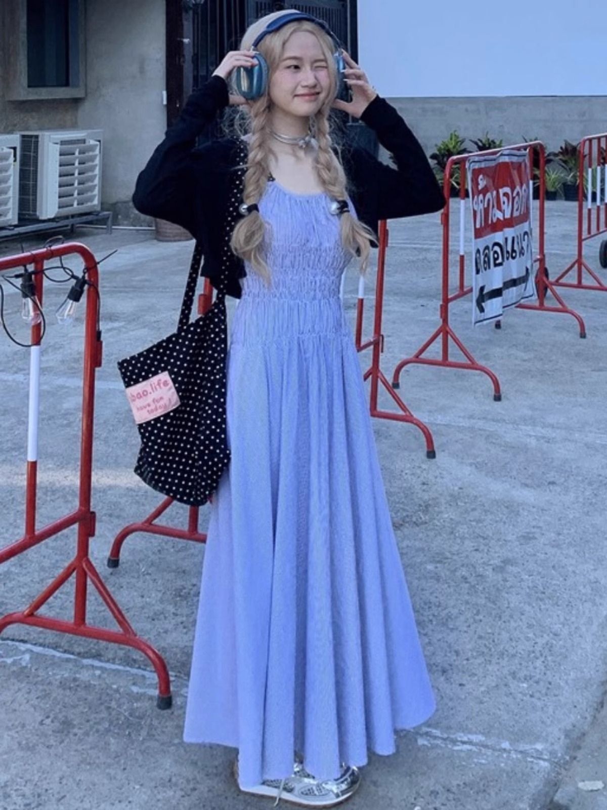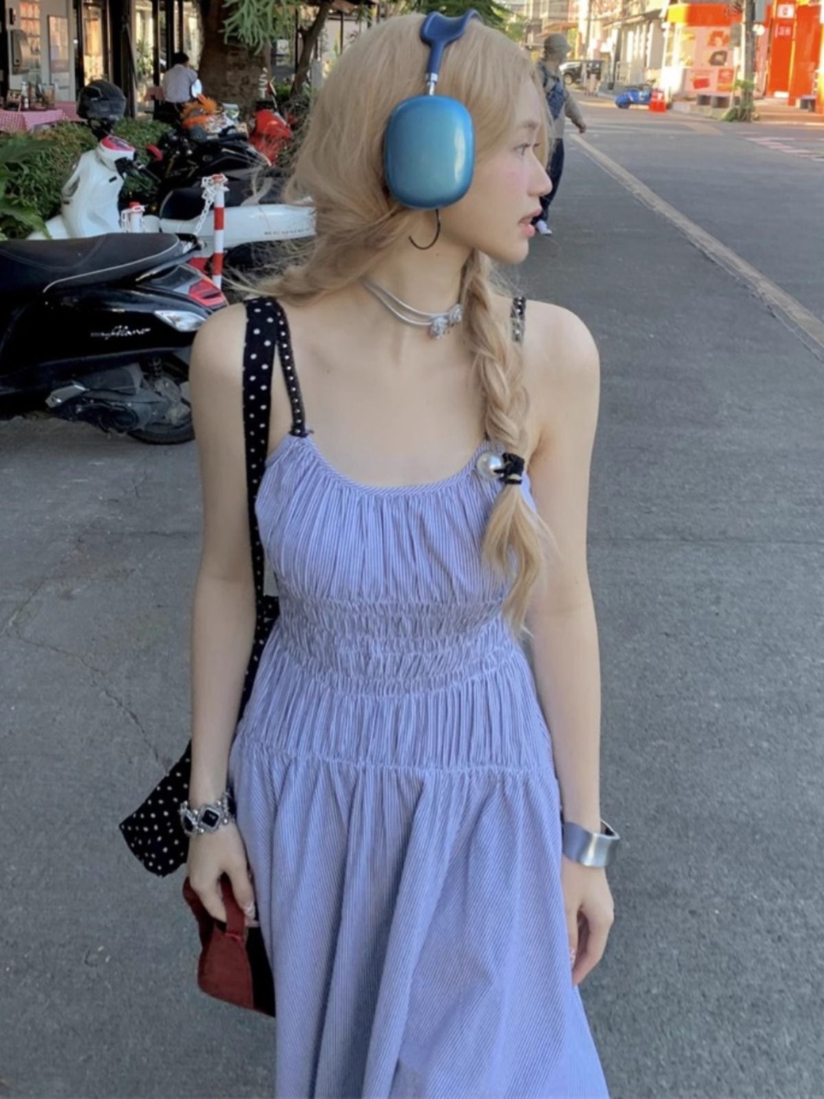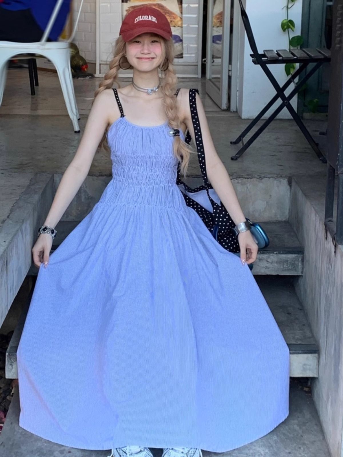 Blue spaghetti strap dress for women, summer 2025 new style, French beach resort look, fitted waist, long.
