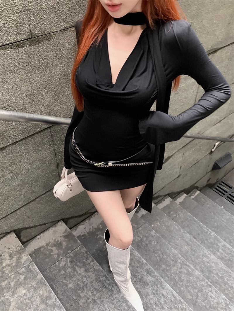 • Hot girl black halter neck long sleeve dress women's autumn slim fit mature woman dress temperament tight waist hip-hugging short skirt