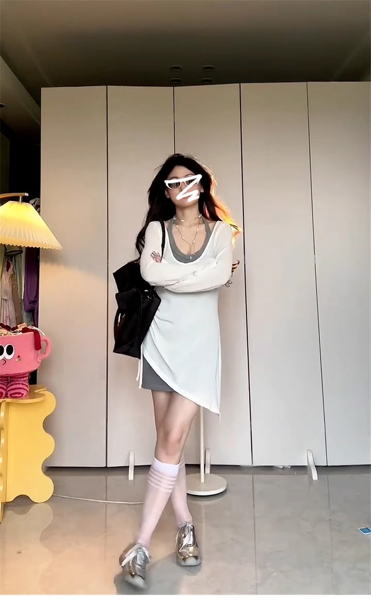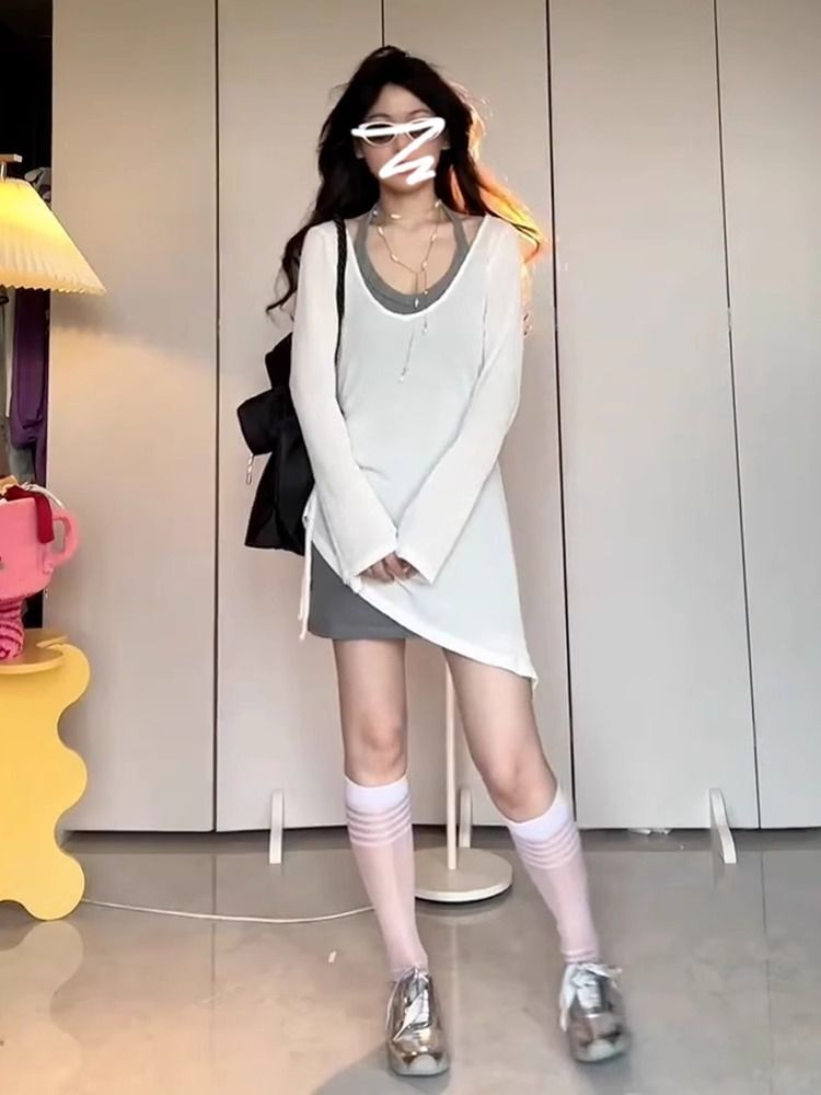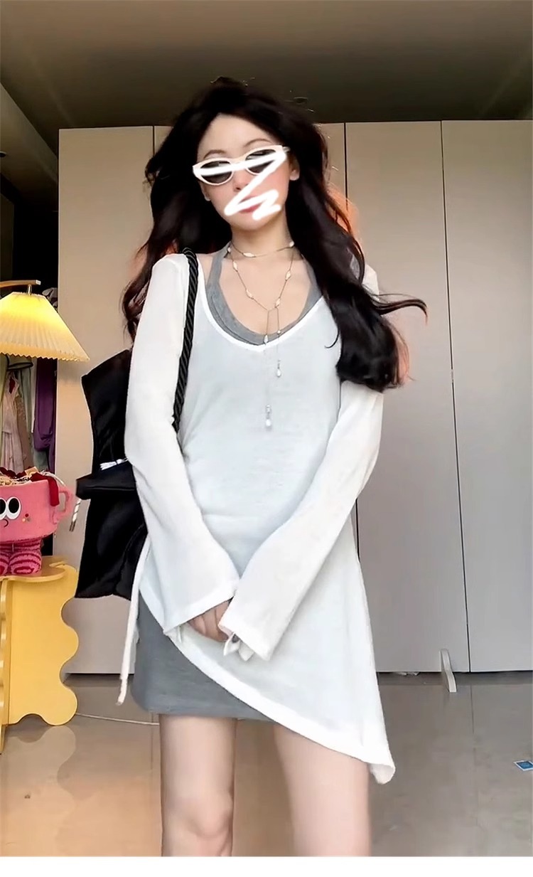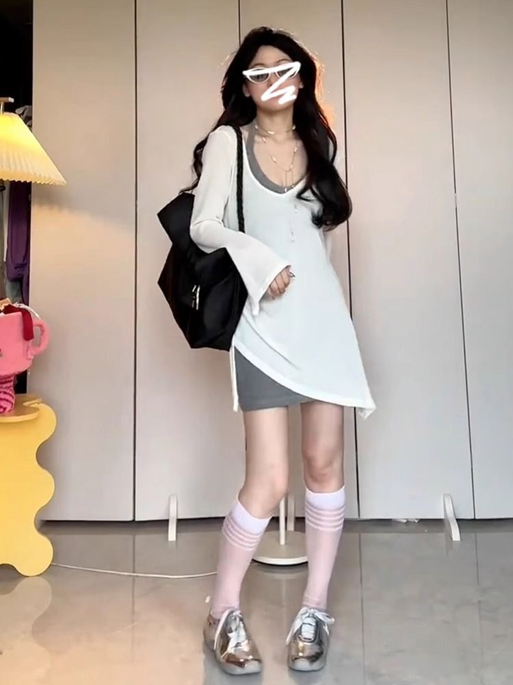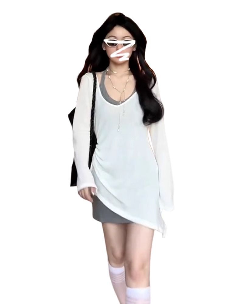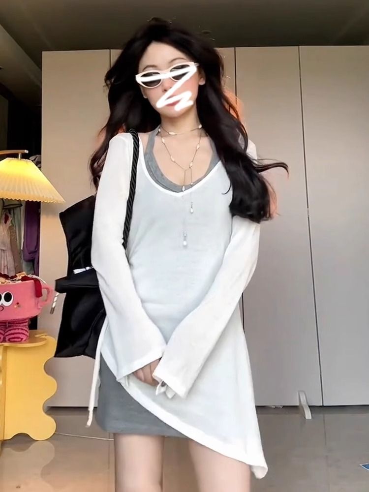 Grey halter neck suspender dress for women, new early autumn 2025 style, petite A-line bodycon mini skirt.