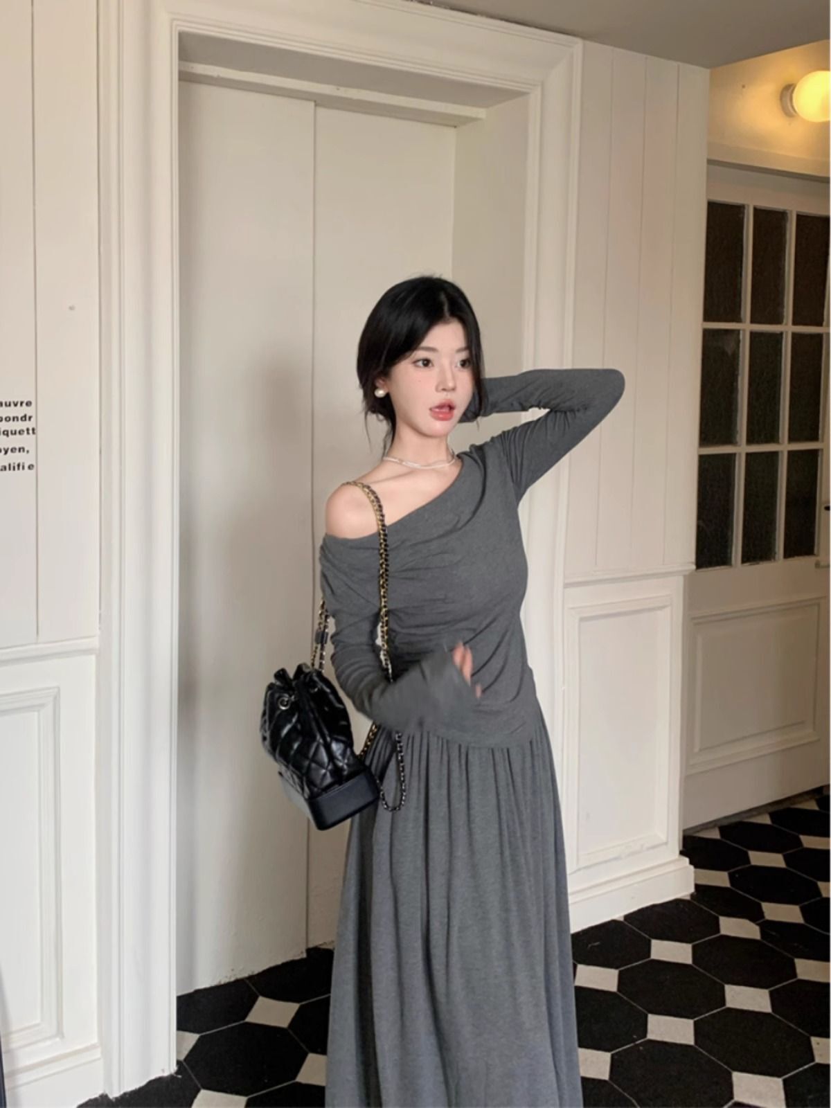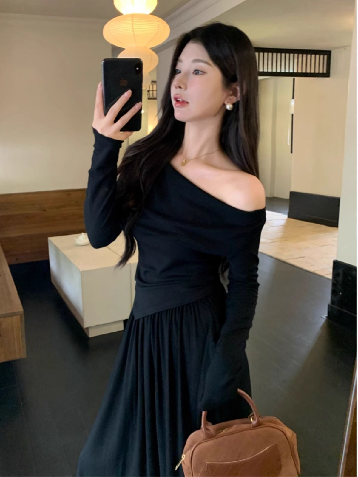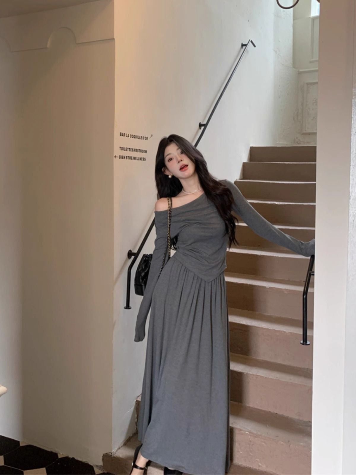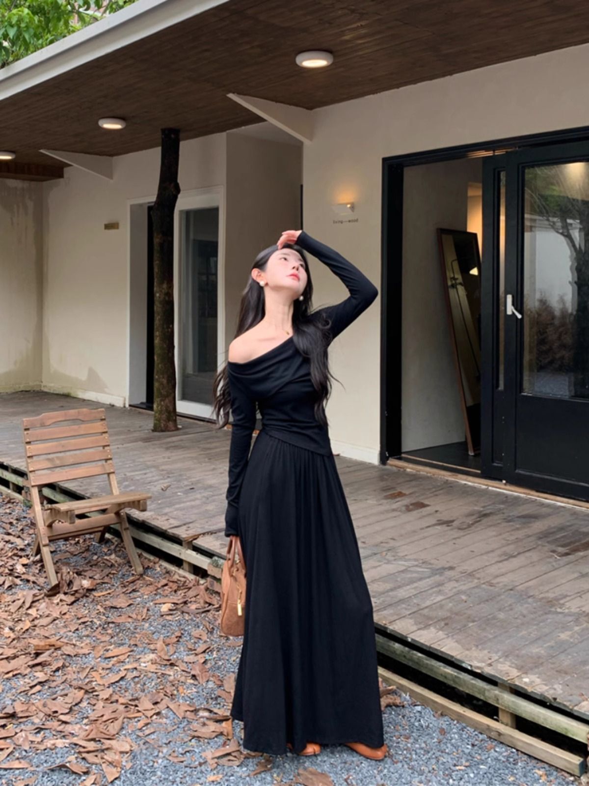 • French casual two-piece set: long-sleeved irregular T-shirt and high-waisted slimming skirt for early autumn.
