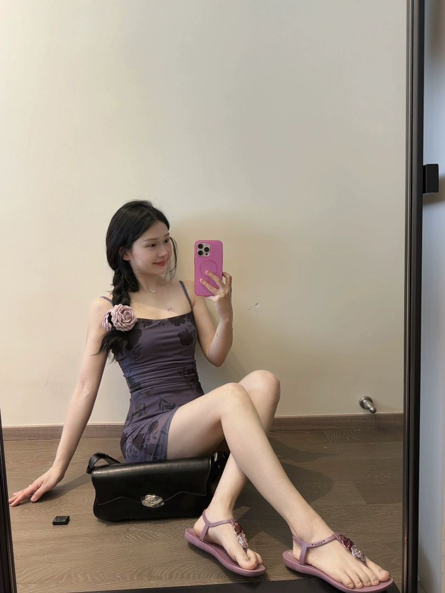 • French-style printed mesh purple slip dress for women, summer slim-fitting bodycon mini skirt